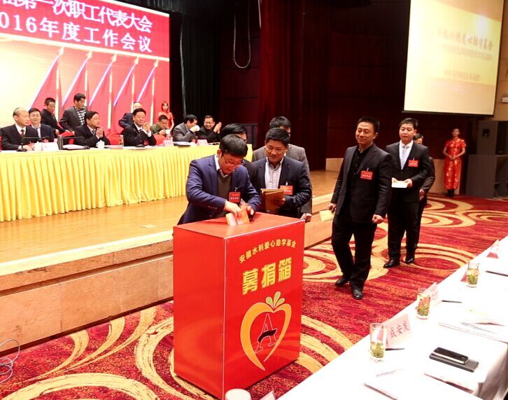2016年3月4日上午,在安徽水利職代會上,舉行了“安徽水利愛心助學基金”第二次公開募捐儀式。捐款現場播放了基金宣傳片,溫馨而感人,安徽水利員工紛紛慷慨解囊,共募得善款近14萬元。