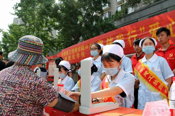 早上七點半,小志愿者們就背著器材、抬著桌椅,早早趕到合肥市望湖社區,活動于早上八點半正式開始,內容包括為社區的居民義務測量血壓、健康咨詢、保健知識宣傳等,旨在將健康生活帶進社區,改善居民的不良生活習慣。活動期間,小志愿者們各個面帶微笑,積極向居民宣傳健康科普知識,倡導健康科學的生活方式,在為老人測量血壓的過程中,還根據老人的血壓情況,告訴老人一些正確的調節血壓的方法。活動持續了二個半小時,共接待社區居民上百余人次。社區居民們紛紛稱贊此次活動真正把服務送到了居民家門口,希望學校能將此類活動長期開展下去。