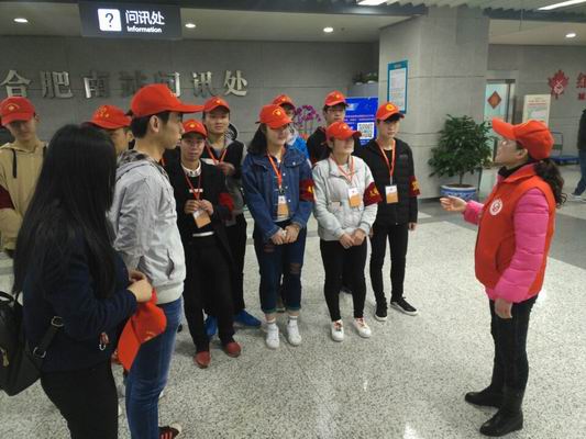 活動開展的三天里,我院學生每天準時準點到達合肥南站詢問處,在志愿者培訓老師簡要介紹工作內容以及要求后,同學們統一領取了帽子和袖章,走上了各自的服務崗位。