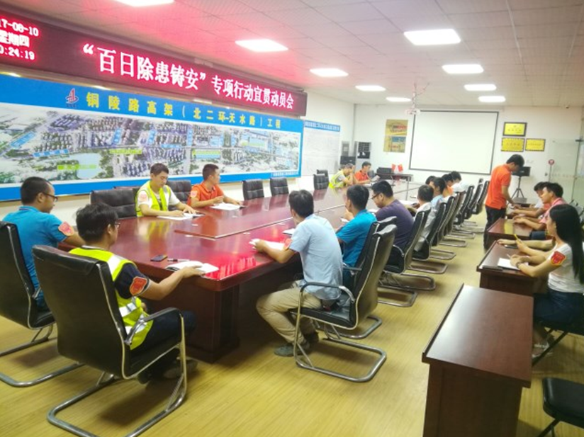 8月10日晚,安徽路港銅陵路高架項目部組織召開“百日除患鑄安”動員大會,項目部全體職工、“青安崗”成員及班組長約30人參加,項目部安全部長曹志強主持會議。