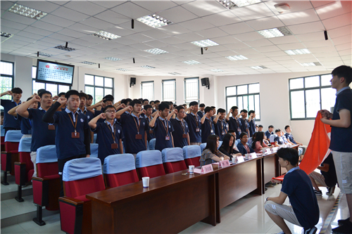 隨后,汽車與機電技術系書記助理蔡克老師宣讀了《關于同意成立“紅馬甲”青年志愿者服務隊的批復》。德育工作部副主任、團委書記周曉瑛同志為“紅馬甲”青年志愿者服務隊授旗。“紅馬甲”青年志愿者服務隊副隊長陳亞楠老師宣讀了《“紅馬甲”青年志愿者服務隊章程》。18機電一體化班的李成同學代表青年志愿者發言,并帶領全體青年志愿者面對隊旗進行了宣誓。