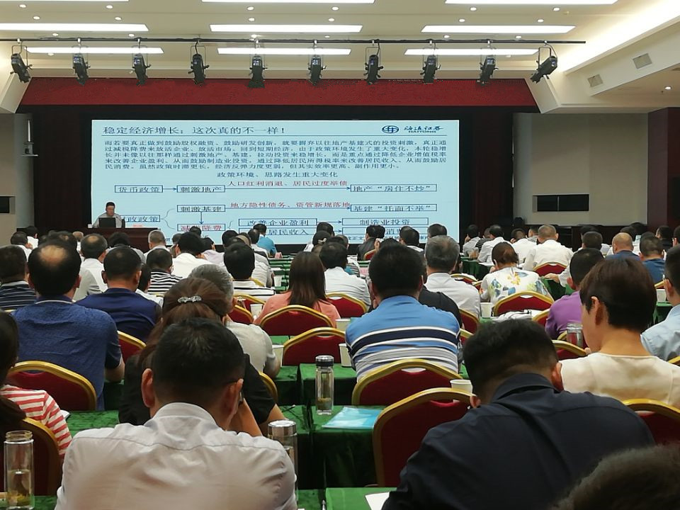 海通證券于博老師從我國國情出發,緊密圍繞人口紅利消退、舉債發展經濟,債務周期見頂、去杠桿四步曲,貿易摩擦再現、短期迎來休戰,轉型勢在必行、經濟緩慢筑底,降利率提估值、從實物到金融等五個方面,宏觀分析了國內經濟發展情況,并對2019年下半年經濟及資本市場進行了展望。本次講座內容豐富翔實、圖文并茂,與會人員聚精會神地聆聽,并認真地做筆記。