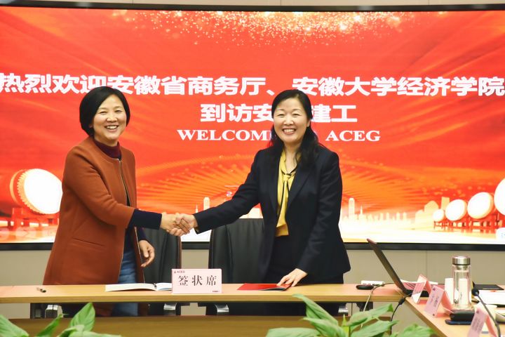 4月7日下午,安徽建工集團(tuán)股份有限公司與安徽大學(xué)經(jīng)濟(jì)學(xué)院在安建大廈12樓舉行校企合作簽約儀式。建工股份副總經(jīng)理、海外事業(yè)部黨總支書記、總經(jīng)理邢應(yīng)梅、安徽大學(xué)經(jīng)濟(jì)學(xué)院黨委書記顧廣玲分別代表雙方簽署協(xié)議,安徽省商務(wù)廳外經(jīng)處處長(zhǎng)孫永彬、建工控股(股份)人力資源部部長(zhǎng)朱金蓉出席簽約儀式并講話。安徽大學(xué)經(jīng)濟(jì)學(xué)院副院長(zhǎng)田淑英、華德亞、經(jīng)濟(jì)學(xué)院國(guó)貿(mào)系主任李保民、國(guó)貿(mào)系國(guó)際經(jīng)濟(jì)學(xué)教研室主任呂孝能、海外事業(yè)部領(lǐng)導(dǎo)班子成員、駐外機(jī)構(gòu)負(fù)責(zé)人及安徽大學(xué)校友代表參加了簽約儀式。
