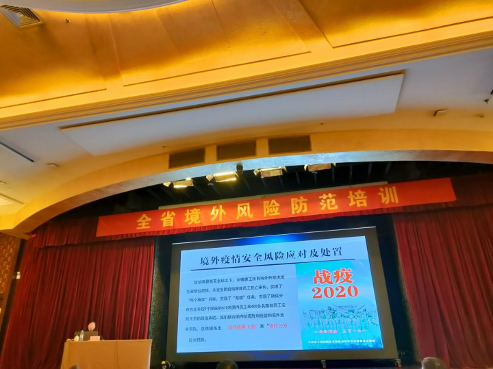 7月15日下午,安徽建工集團股份公司副總經理,海外事業部黨總支書記、總經理邢應梅應邀參加全省境外風險防范培訓班并作《企業境外安全風險防范》專題授課。該培訓由安徽省商務廳主辦,安徽省各地市商務主管部門負責人和省內外經外貿企業負責人近200人參加培訓。
