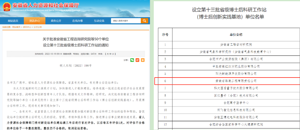 近日,安徽省人力和資源保障廳發(fā)布了《第十三批省級博士后科研工作站(博士后創(chuàng)新實踐基地)名單》(皖人社秘〔2022〕198號),集團所屬安徽省路港工程有限責任公司成功獲批省級博士后科研工作站,自此集團公司博士后工作站規(guī)模達3個,標志著集團公司在高水平科學研究、高層次人才培養(yǎng)方面又取得了重大突破。