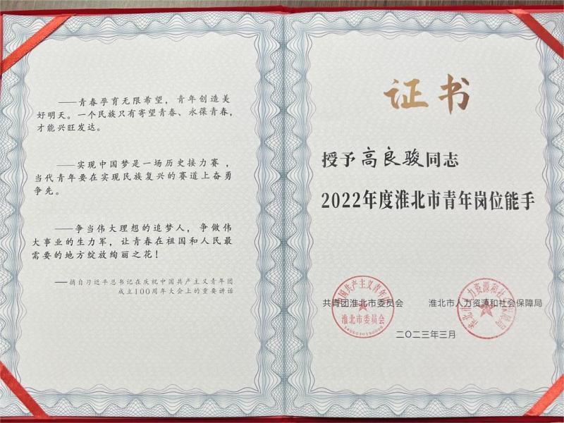為深入學習貫徹習近平新時代中國特色社會主義思想,認真貫徹落實習近平總書記對技能人才工作的系列重要指示精神,淮北市團市委聯合淮北市人力資源和社會保障局開展了2022年度“淮北市青年崗位能手”命名活動,建材科技三分公司高良駿被授予“淮北市青年崗位能手”榮譽稱號。