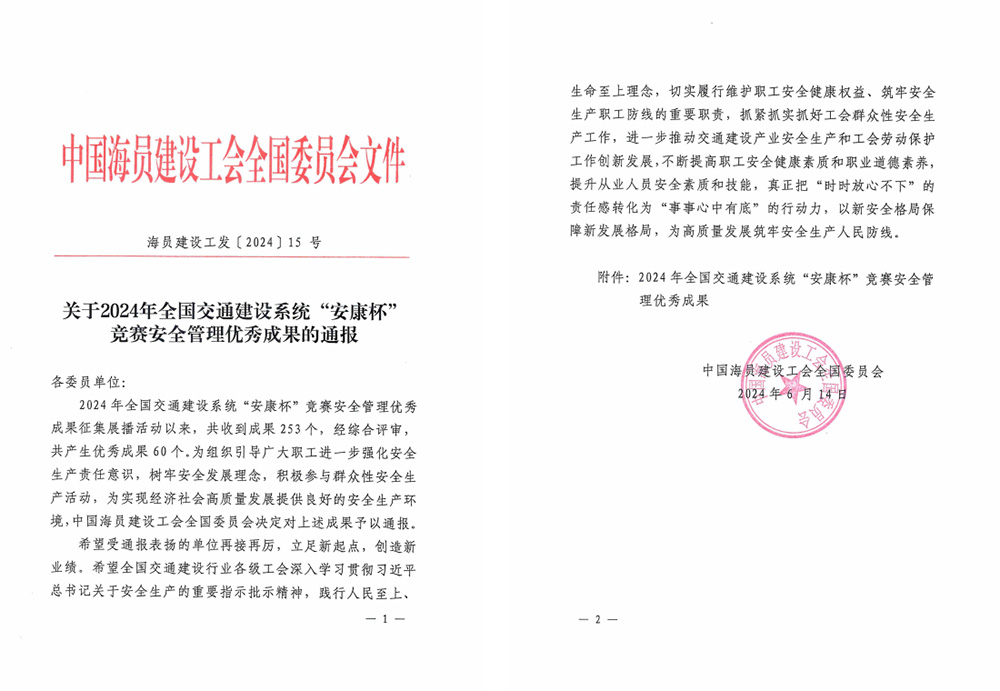 集團選送視頻作品獲評“2024年全國交通建設系統安康杯競賽安全管理優秀成果”稱號