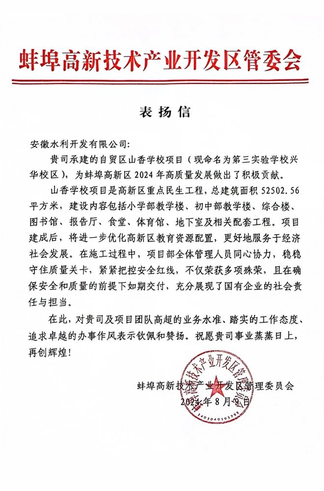 近日,安徽水利山香學(xué)校項(xiàng)目獲蚌埠高新區(qū)管委會(huì)來(lái)信表?yè)P(yáng),對(duì)項(xiàng)目團(tuán)隊(duì)在建設(shè)過程中付出的努力和取得的成績(jī)給予高度評(píng)價(jià)。