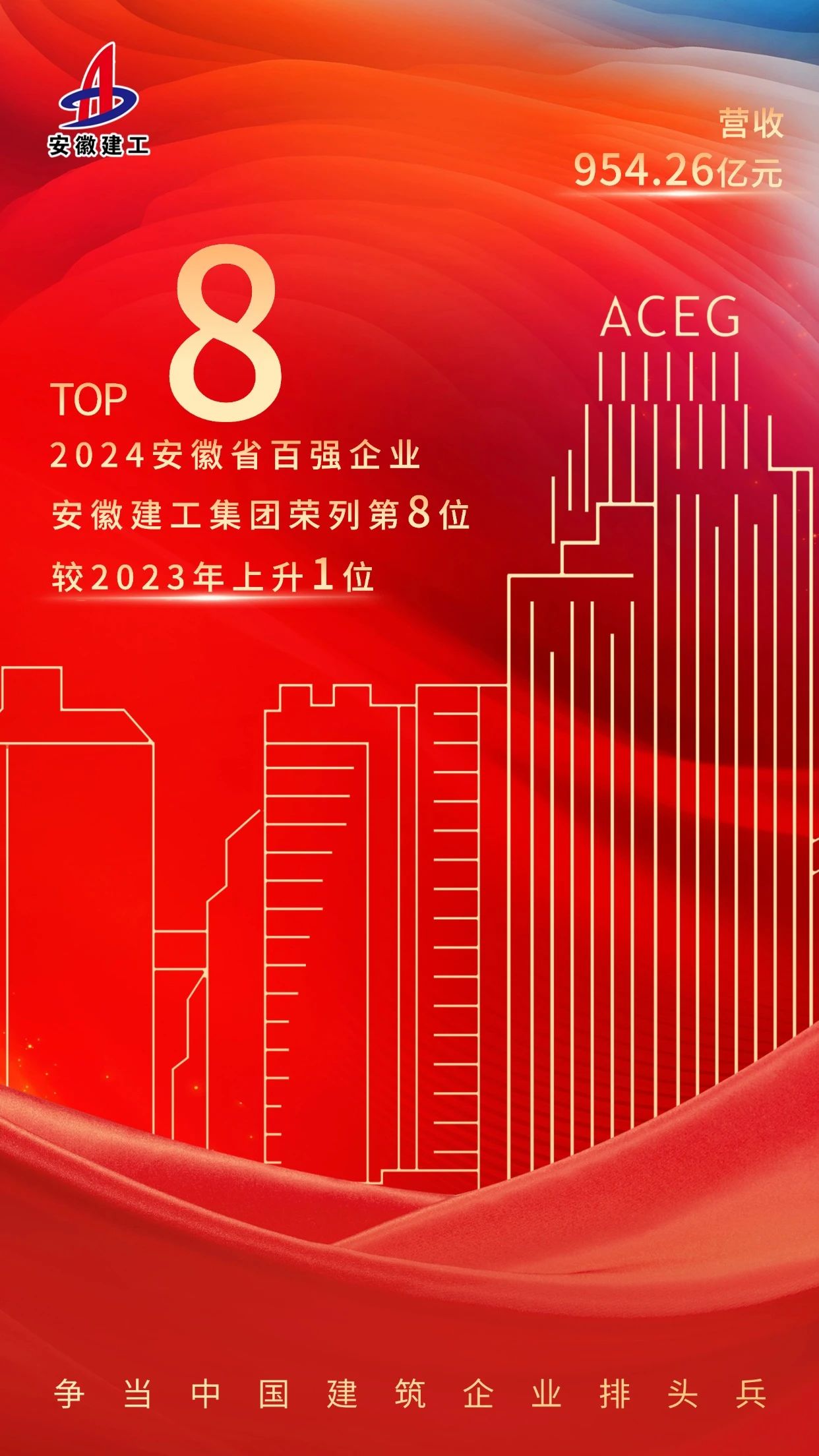 11月23日,安徽省企業聯合會、企業家聯合會發布“2024安徽省百強企業榜單”,安徽建工集團控股有限公司以營業收入954.26億元的成績榮列“2024安徽省百強企業”榜單第8位,較2023年上升一位。