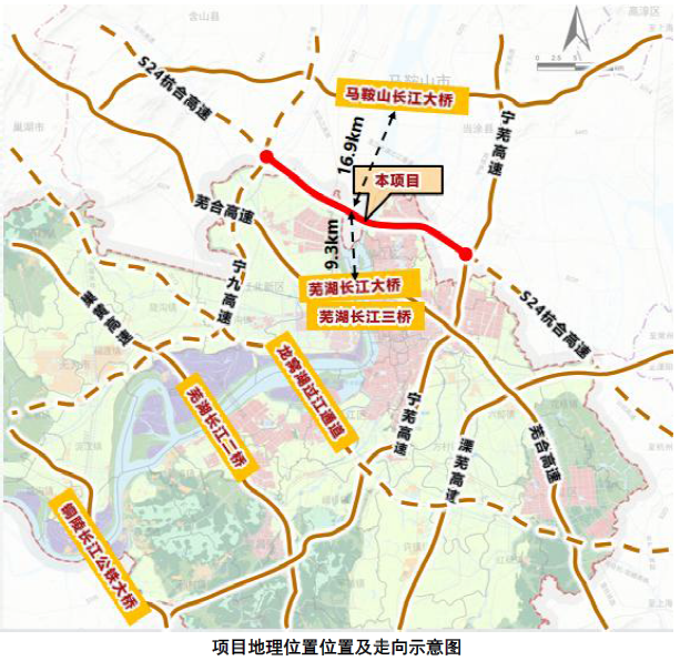 該項目是納入國家《長江干線過江通道布局規劃(2020-2035年)》的近期建設項目,能有效改善當地高速路網,帶動沿線經濟社會發展。項目主體位于蕪湖市,起于馬鞍山市和縣功橋鎮,主線長30.88km(其中跨江大橋段長8.39km),連接線長14.35km,起點與G4231寧九高速交叉,終點與G4211寧蕪高速交叉,順接S24杭合高速當涂至宣城段,全線共設置4處收費站,6處互通。建設期48個月,收費期限356個月。