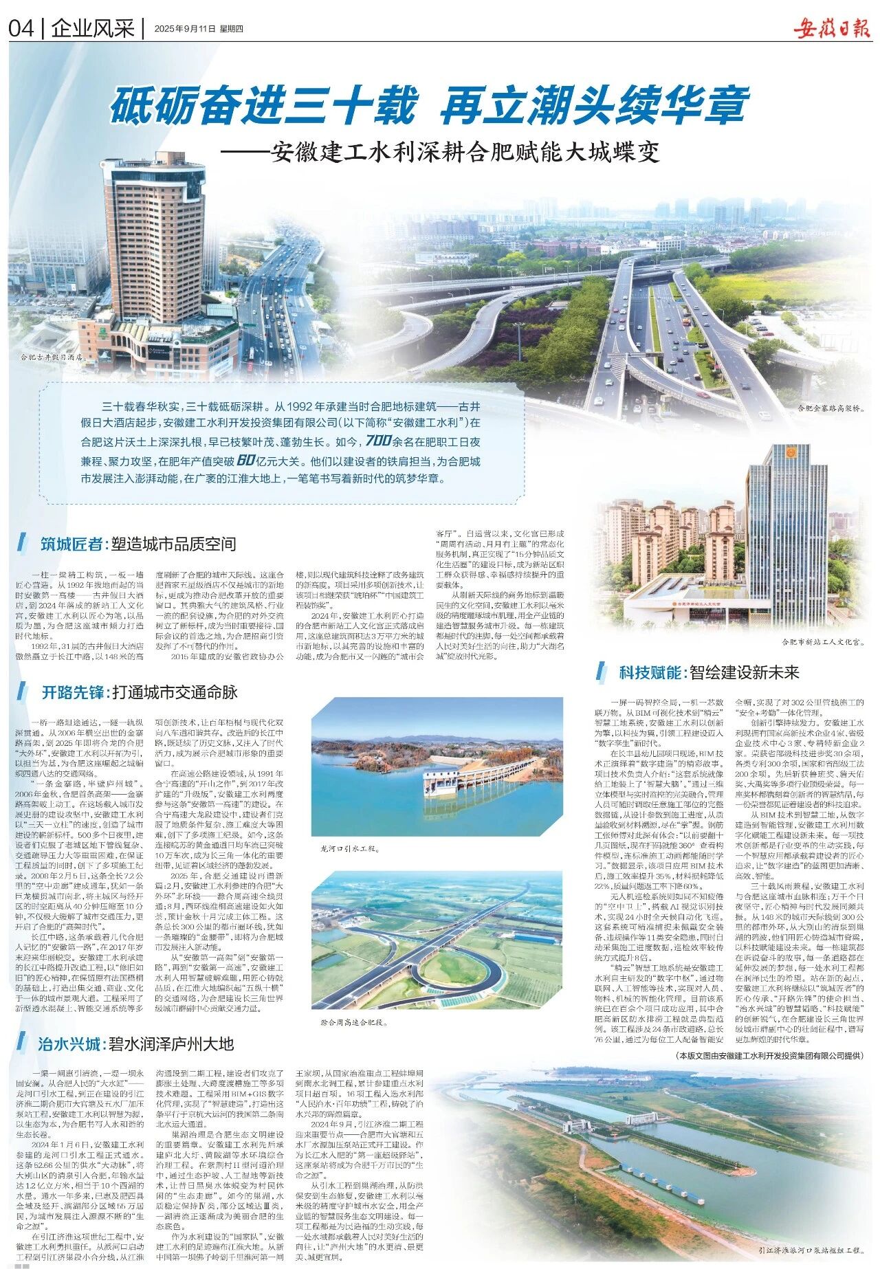 三十載風(fēng)雨兼程,安徽建工水利與合肥這座城市血脈相連;萬千個日夜堅守,匠心精神與時代發(fā)展同頻共振。從148米的城市天際線到300公里的都市外環(huán),從大別山的清泉到巢湖的碧波,他們用匠心鑄造城市脊梁,以科技賦能建設(shè)未來。每一棟建筑都在訴說奮斗的故事,每一條道路都在延伸發(fā)展的夢想,每一處水利工程都在潤澤民生的希望。站在新的起點,安徽建工水利將繼續(xù)以“筑城匠者”的匠心傳承、“開路先鋒”的使命擔(dān)當(dāng)、“治水興城”的智慧韜略、“科技賦能”的創(chuàng)新銳氣,在合肥建設(shè)長三角世界級城市群副中心的壯闊征程中,譜寫更加輝煌的時代華章。