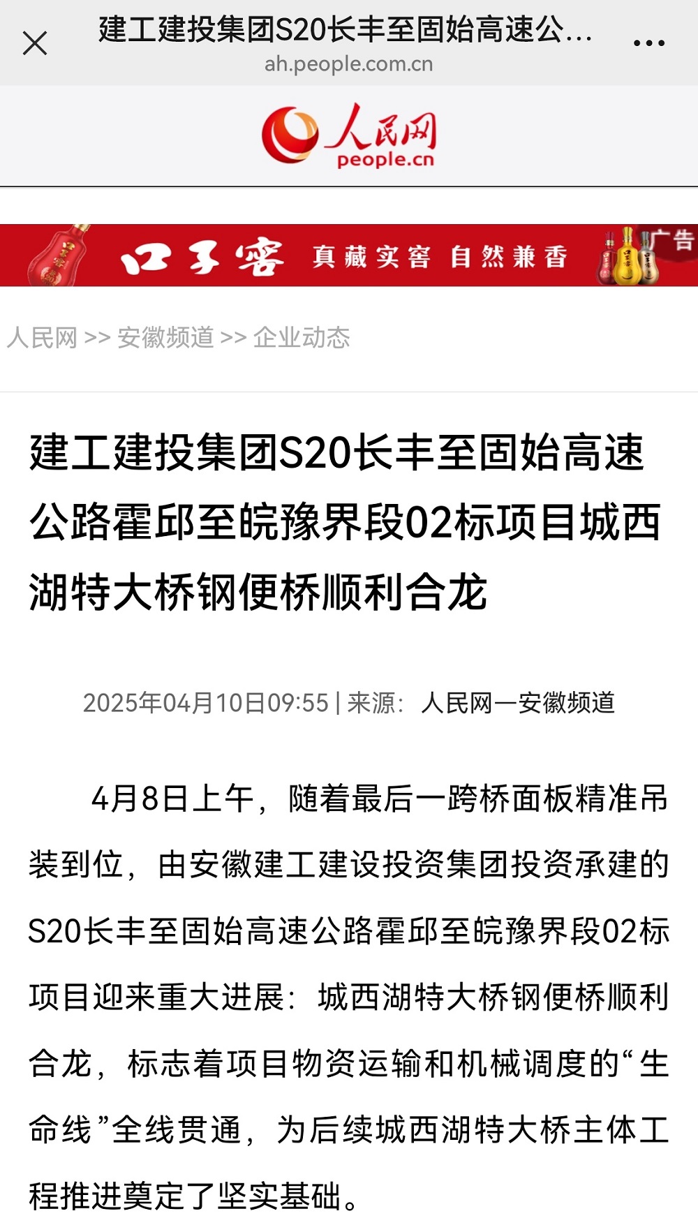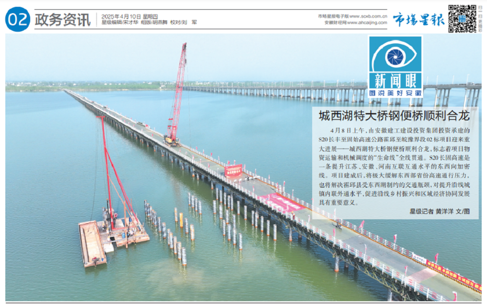 4月8日,建工建投S20長豐至固始高速公路霍邱至皖豫界段工程路基路面02標城西湖特大橋鋼便橋順利合龍貫通。人民網、《市場星報》深入項目一線展開報道,稿件登上人民網安徽頻道首頁。