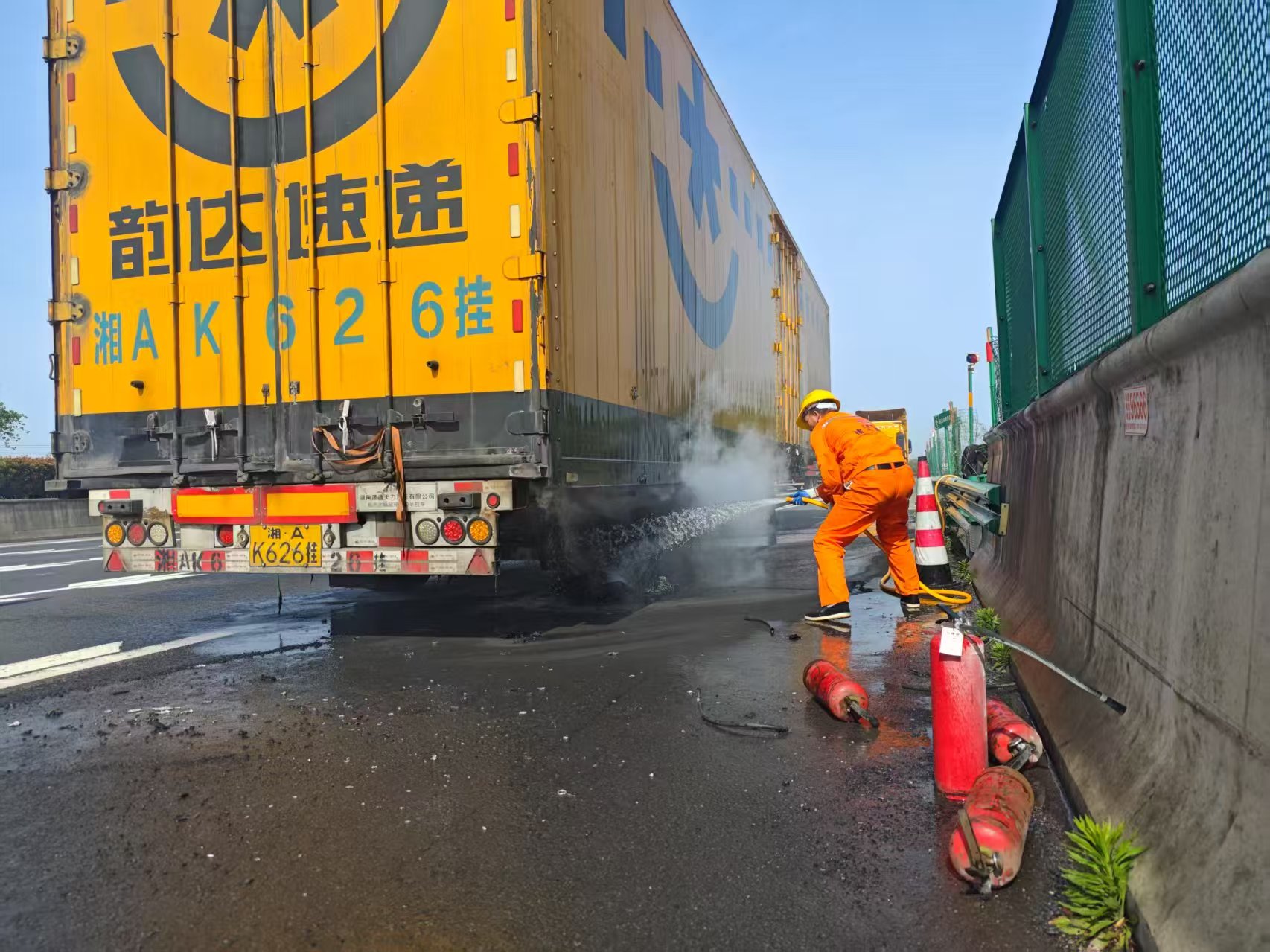 當天,施工現(xiàn)場的工作人員發(fā)現(xiàn)不遠處一輛物流車濃煙滾滾,火苗正從車廂處不斷竄出。項目負責人接報后,迅速組織現(xiàn)場施工人員攜帶滅火設(shè)備趕赴現(xiàn)場。同時,安排專人在后方設(shè)置警示標志,疏導交通,防止二次事故發(fā)生。