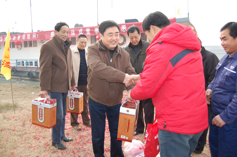 上午八時(shí)三十分,胡董事長(zhǎng)一行來(lái)到皖工宿02號(hào)船舶會(huì)議室,同節(jié)日期間加班的船員一一握手,詳細(xì)了解了節(jié)日期間的工程進(jìn)展和工程處施工運(yùn)行情況,并詢(xún)問(wèn)了值班人員的工作和生活情況。胡董事長(zhǎng)親切地說(shuō):大家好!今天是新春佳節(jié),同志們堅(jiān)守在工作崗位上,我代表集團(tuán)公司向大家表示節(jié)日的慰問(wèn),向大家拜年!并向你們的親人表示親切的慰問(wèn),祝大家春節(jié)愉快,闔家歡樂(lè),工作進(jìn)步。大家的工作非常辛苦,在新春佳節(jié)之際,同志們恪盡職守、任勞任怨的精神令人感動(dòng)!希望你們今后再接再厲,共創(chuàng)疏浚事業(yè)的輝煌!
