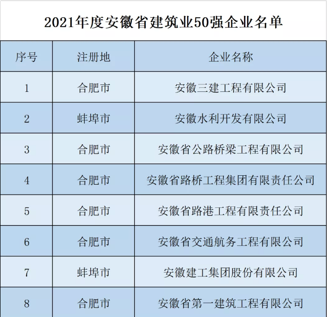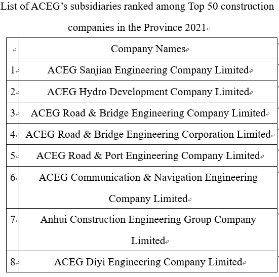 February 10 / Hefei City / Some media reports said,Anhui Provincial Housing and Urban-rural Development Department announced the list of Top 50 enterprises in construction industry in Anhui Province in 2021, among which 8 subsidiaries from Anhui Construction Engineering Group Holdings Co., Ltd. were ranked as top 50 enterprises in construction industry in Anhui Province in 2021.
